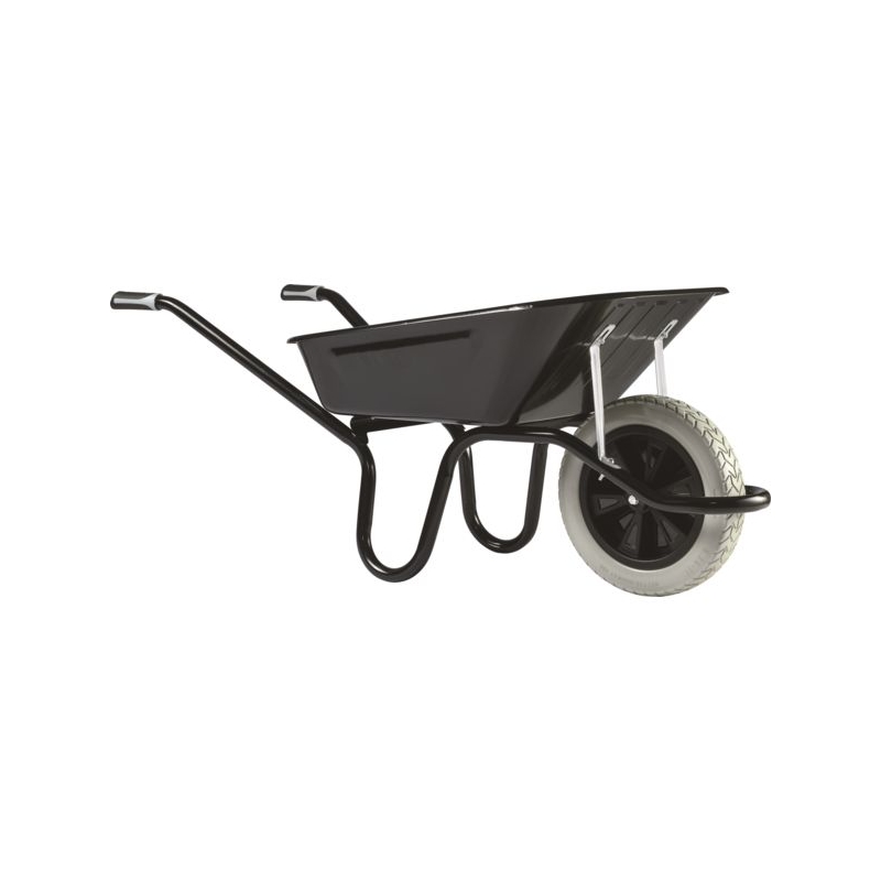 Pour les travaux du bâtiment. Caisse peinte noire 100 L, épaisseur 1 mm. Châssis en tube peint CP2i® (pieds intégrés), indéformable avec support caisse. Roue increvable Ø 400 mm, jante polypropylène. Poignées bi-matières. Charge utile : 200 kg Poids : 11.5 kg