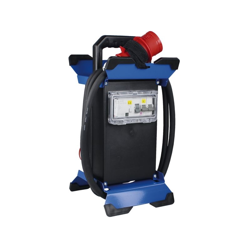 2m câble HO7 RNF 5G2.5 3 prises NF 1PNT/16A/250V 2 prises CEI 3PNT/16A/440V 1 bouton arrêt d'urgence 1 interrupteur différentiel 1 disjoncteur Coffret et prises protégés des chocs et de la boue (2 châssis métalliques) Puissance : 11 kW Indice de protection : IP44