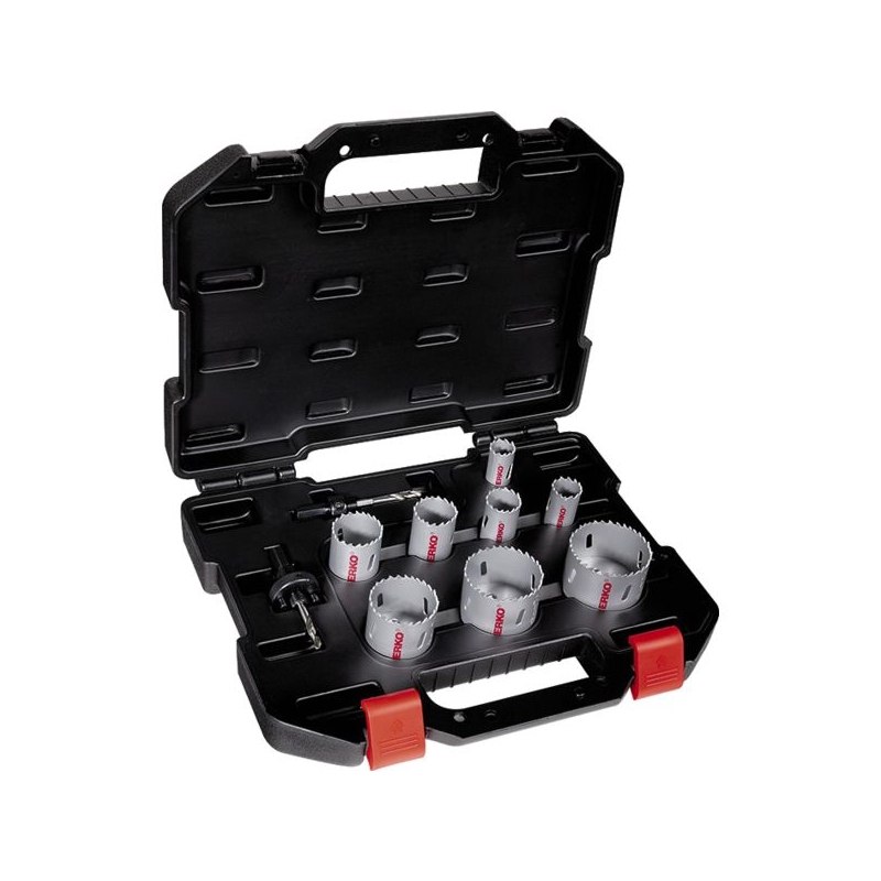 Pour la découpe des aciers, des inox, des non-ferreux, des bois cloutés. Mallette robuste, sécurisable par cadenas. Composé de : - 8 scies Ø 22 - 25 - 29 - 35 - 40 - 51 - 60 - 67 mm, - 2 arbres.