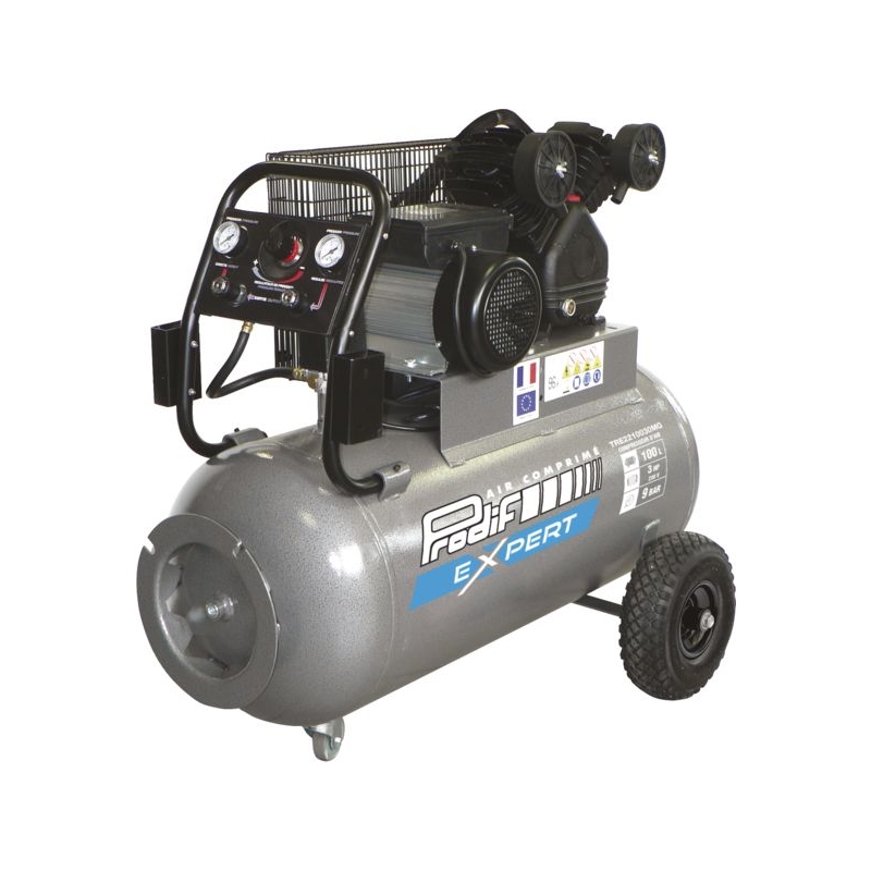Monoétagé, bicylindre fonte en V. Entraînement par courroie. Roues gonflables. Puissance : 3 cv Réservoir : 100 l Débit aspiré : 21 m³/h Débit restitué : 16,2 m³/h Pression maxi. : 9 bar Vitesse de rotation : 1115 tr/mn Dimensions : 104 x 50 x 80 cm