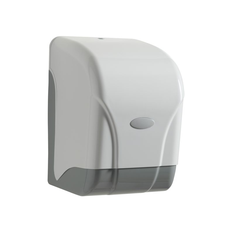 Distributeur pour bobine d'essuyage à dévidage central. En ABS blanc, ouverture frontale, 4 points de fixation. Verrouillage par serrure à clé plastique. Pour toute bobine d'essuyage jusqu'à Ø 220 mm et hauteur 250 mm. L x H x P : 260 x 370 x 255 mm
