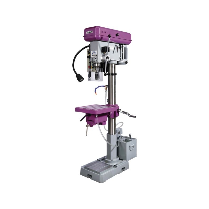 Système de taraudage semi-automatique avec inversion manuelle, capacité M16. Moteur 2 vitesses. Butée de profondeur de perçage. Arrosage de série. Éclairage 24 V. Écran polycarbonate asservi. Arrêt coup de poing à accrochage. Table-étau réversible 2 positions, vernier gradué. Étau monté sur glissière. Déplacement de la table par crémaillère. Mandrin autoserrant. Alimentation : 400 V triphasée Puissance : 1,5 kW Capacité de perçage : 35 mm Capacité de taraudage : 16 mm 18 vitesses : 115 à 1910 tr/mn Cône morse : CM4 Ø colonne : 102 mm Course de broche : 140 mm Poids : 270 kg