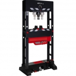Pompe à deux vitesses. Vérin mobile. 100% des commandes se font avec le pied (4 pédales avec 4 fonctions: de relâche, approche pneumatique, approche rapide hydraulique, travail en pression). Tablier soutenu par des vérins, se descend et se lève manuellement. Levier d'approche rapide. Levier de force. Manomètre protégé à l'intérieur du cadre. Sécurité hydraulique en cas de surcharge. Capacité : 50 t Course du piston : 195 mm Dimensions : 1920 x 890 x 490 mm Poids : 225 Kg Livrée avec jeu de poinçons.