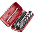 Tête flexible à 180° et verrouillable. Coffret compact. Composé de : - cliquet 1/4'' R.180, - 1 rallonge 100 mm, - 5 douilles 1/4&...